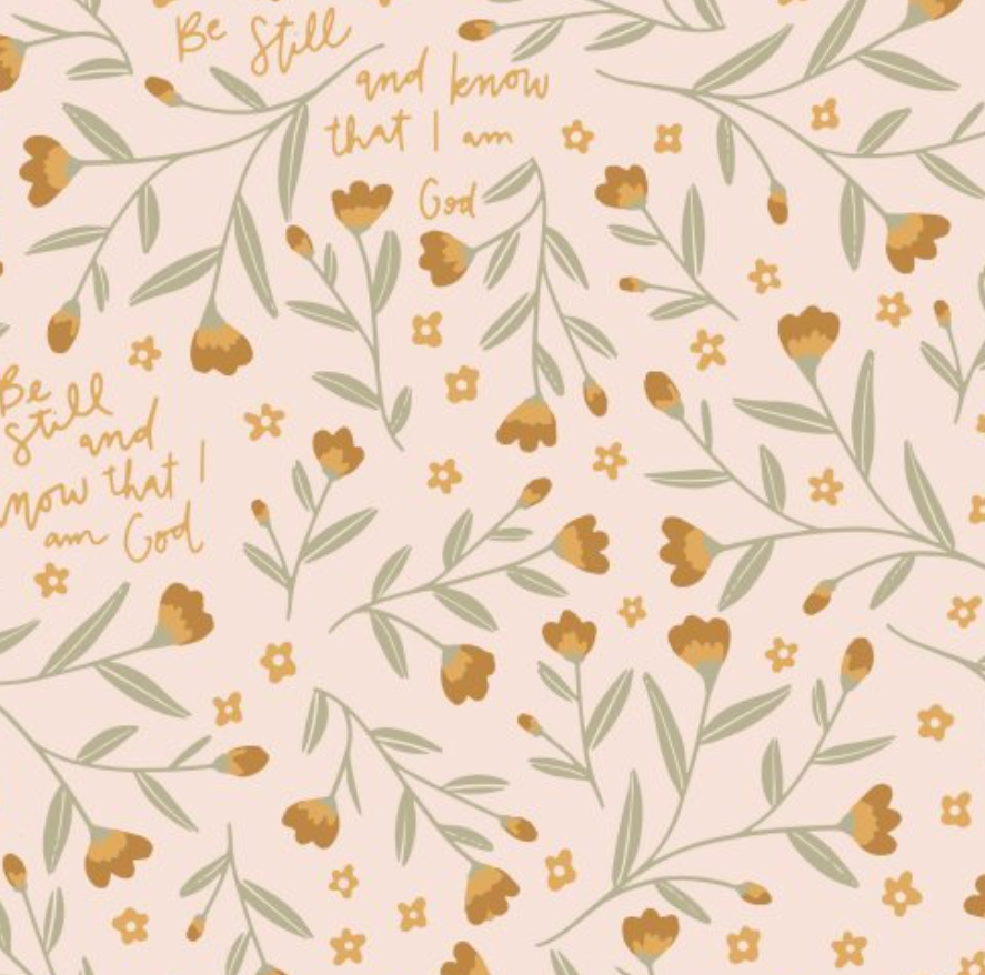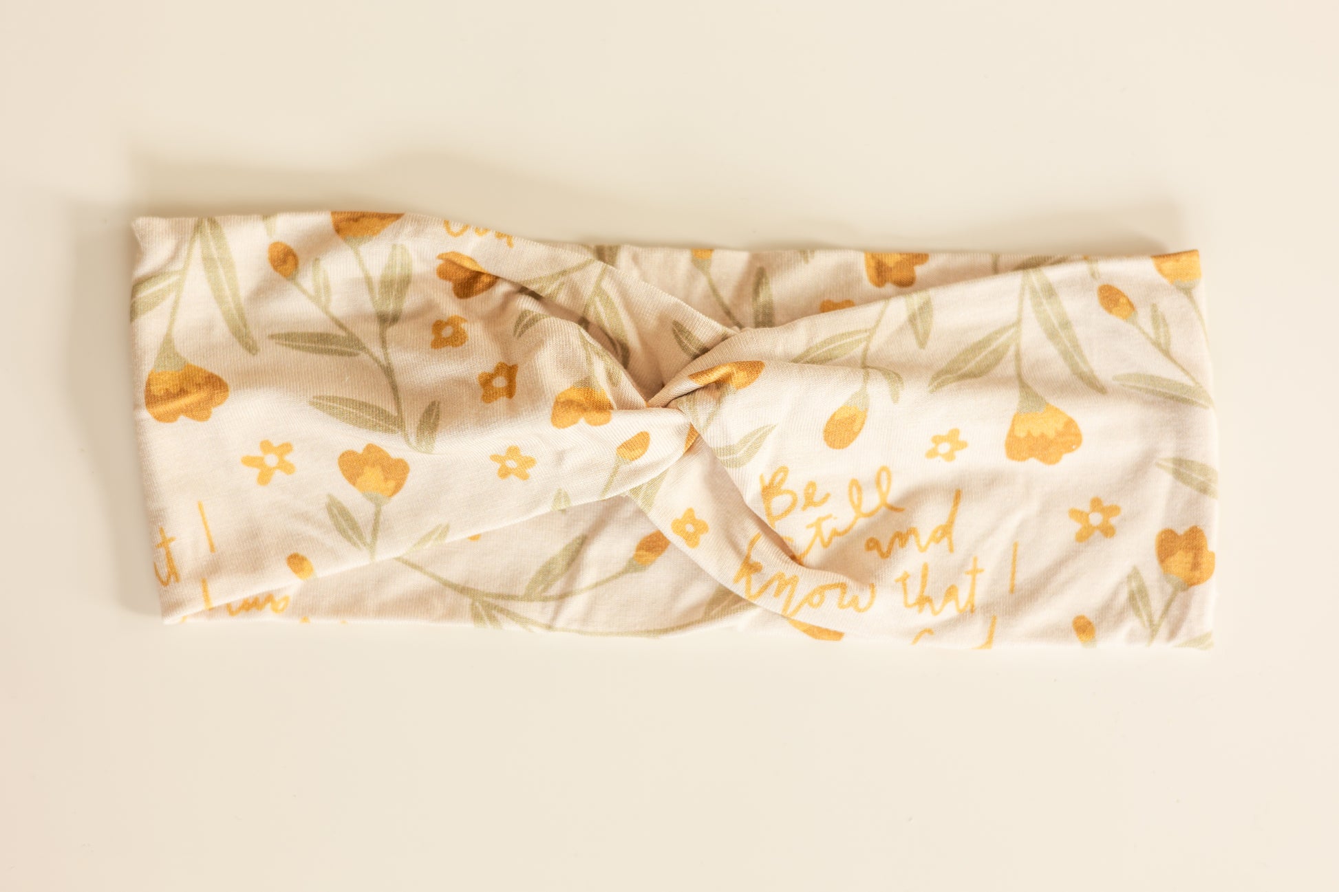 Twist-front headband featuring Psalms 46:10 and a floral pattern